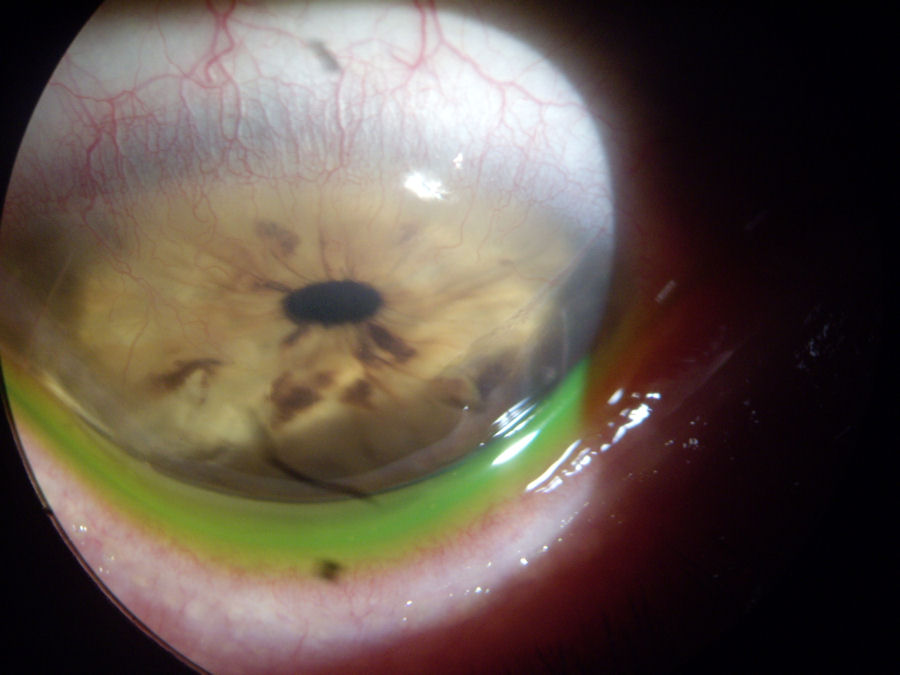 На фотографии ниже представлен глаз пациента, у которого было 2 Операции в РК затем последовали 2 операции LASIK. Повторные операции LASIK привели к врастание эпителия , что потребовало 2 дополнительных операций по подтяжке лоскута. Впоследствии у пациентки развился травматический катаракта , что привело к необходимости операции по удалению катаракты. Этот случай является примером "эффекта домино", связанного с ненужными операциями на глазах. Нажмите на фотографию, чтобы увеличить.