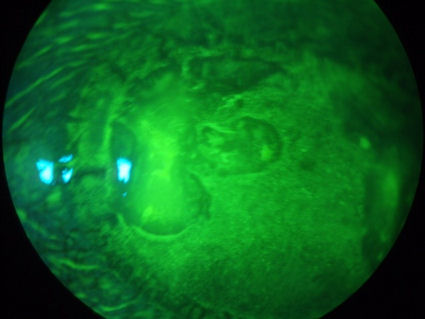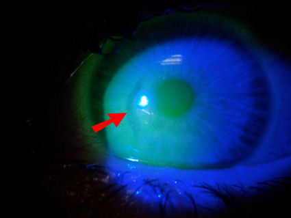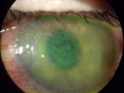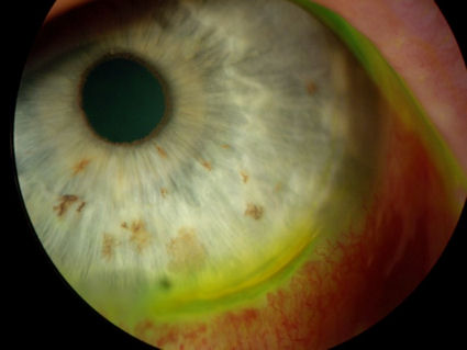 На следующей фотографии изображена роговица пациента, перенесшего операцию LASIK в 2005 году. Глубокое окрашивание по краю лоскута LASIK указывает на наличие открытого отверстия на стыке роговицы и лоскута, что подвергает пациента риску инфицирования условно-патогенными организмами, такими как вирусы и бактерии.