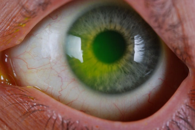 Приведенные ниже фотографии были сделаны с помощью щелевой лампы (биом-микроскопа) после инстилляции флуоресцеиновый краситель . Синий свет используется для подсветки красителя, который окрашивает поврежденные участки роговицы. Желто-зеленый круг по периферии роговицы - это край лоскута LASIK. Он окрашивается, потому что граница раздела все еще открыта, что свидетельствует о неспособности роговицы к полному заживлению.